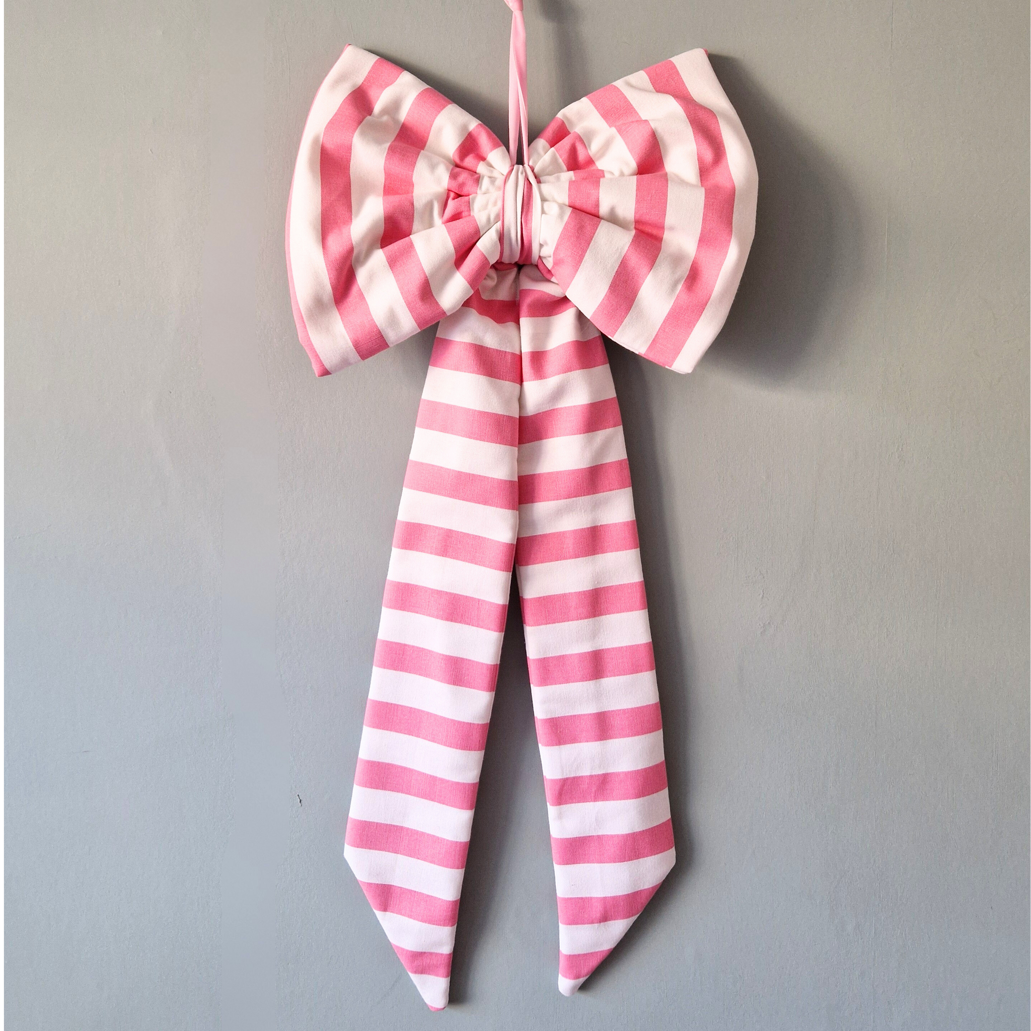 This beautiful handmade fabric bow captures the essence of cottage charm with its pretty pink stripe and romantic aesthetic. A statement bow brings vintage-inspired elegance to any space.